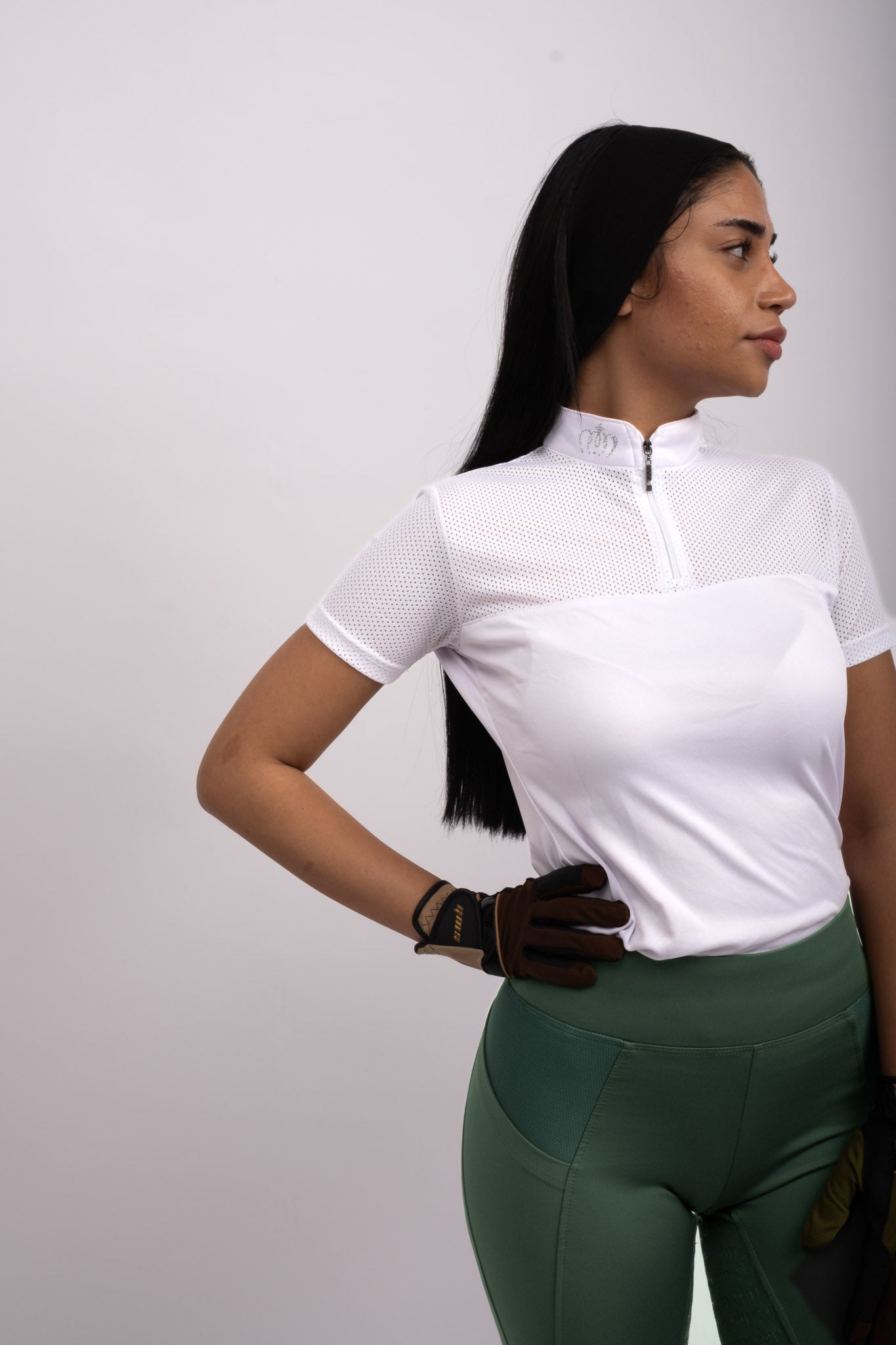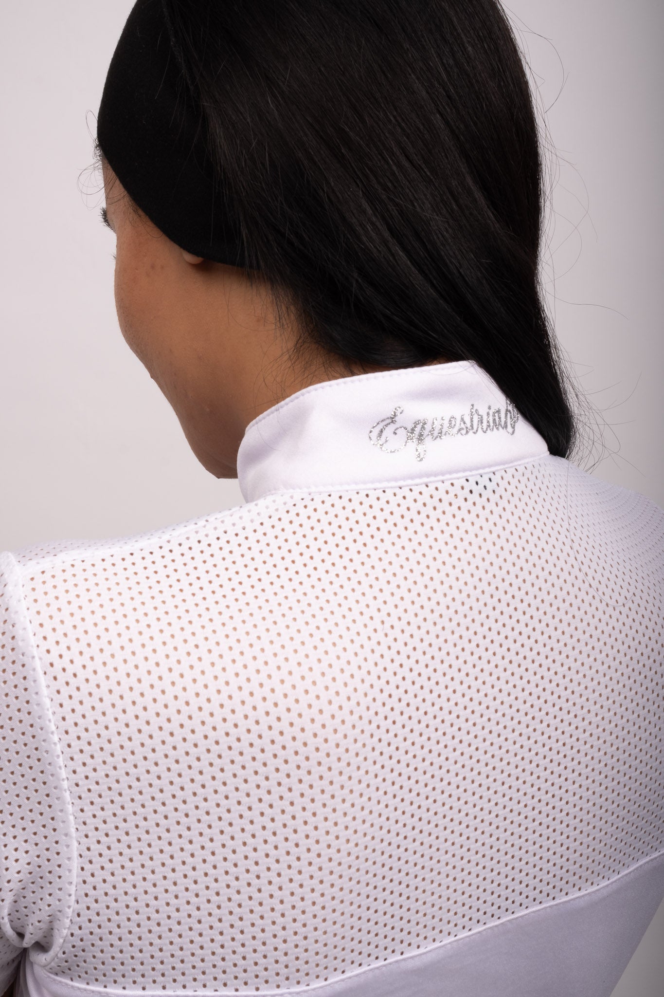 Skjorten er udstyret med en diskret lynlås foran, der ikke kun sikrer en justerbar og sikker pasform, men også tilføjer et elegant og moderne element til ridebanen.